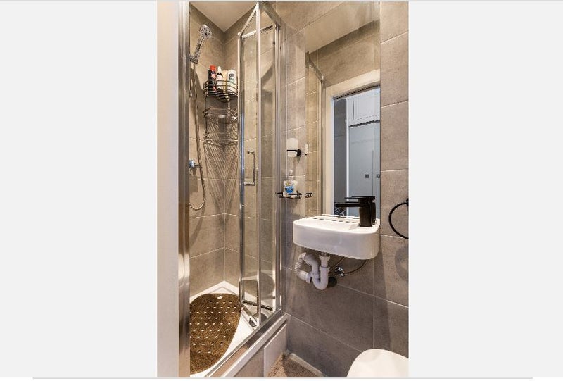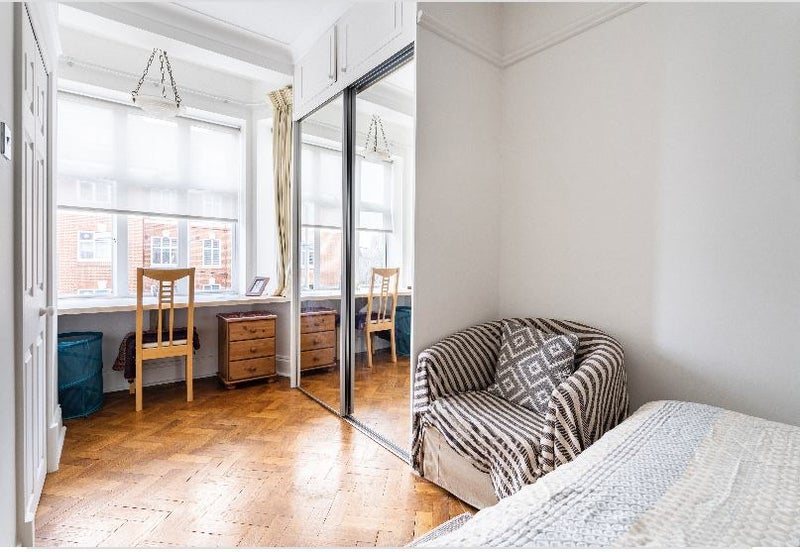 West facing bright room with bay windows overlooking private gardens. Built-in wardrobes for storage. Private en-suite with toilet, sink, shower and underfloor heating.