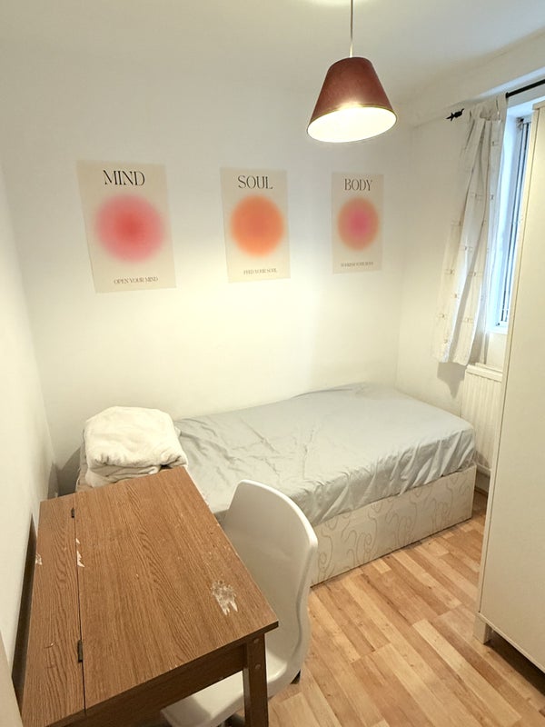 It is fully furnished, with a single bed , a 2-door wardrobe, bedside tables and chair. There is one shared bathroom, and a garden facing kitchen, living room and garden.