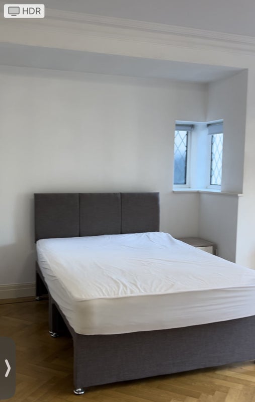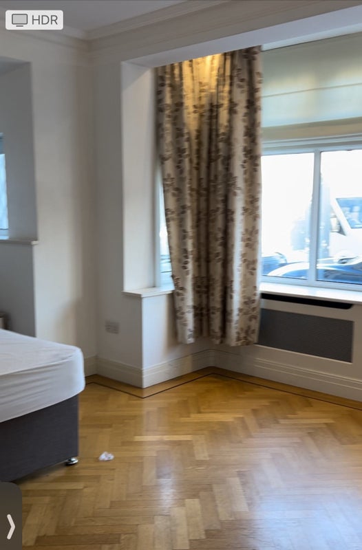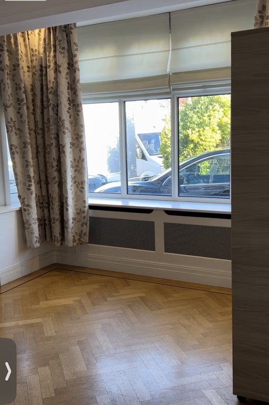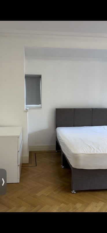 Huge room; furnished with bed, chest of drawers and wardrobe, has beautiful wood flooring and large window.