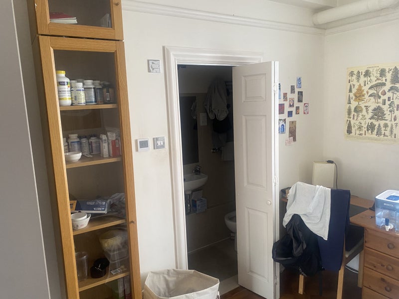 Bright west facing room with large built in wardrobes, desk, chair and private wc, shower and sink.