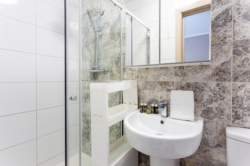 Spacious Private Bathroom: Contemporary bathroom featuring a shower, WC, and wash basin.