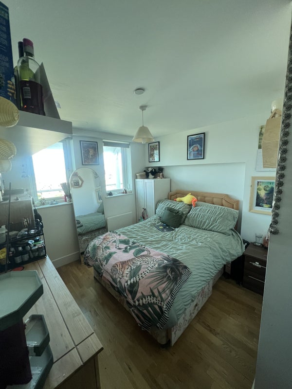 This bedroom is the smallest in the flat and has a shared bathroom next door, which you will share with Ricky. It has a double bed with underneath storage, a white wardrobe and a chest of drawers included. But also room for more storage if you need. It also has a new radiator installed for cold winters and two gorgeous windows which over looks the city scape.
