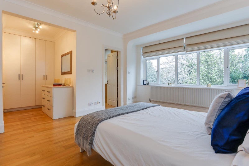Bright first-floor double, fully furnished with bed and wardrobes.
