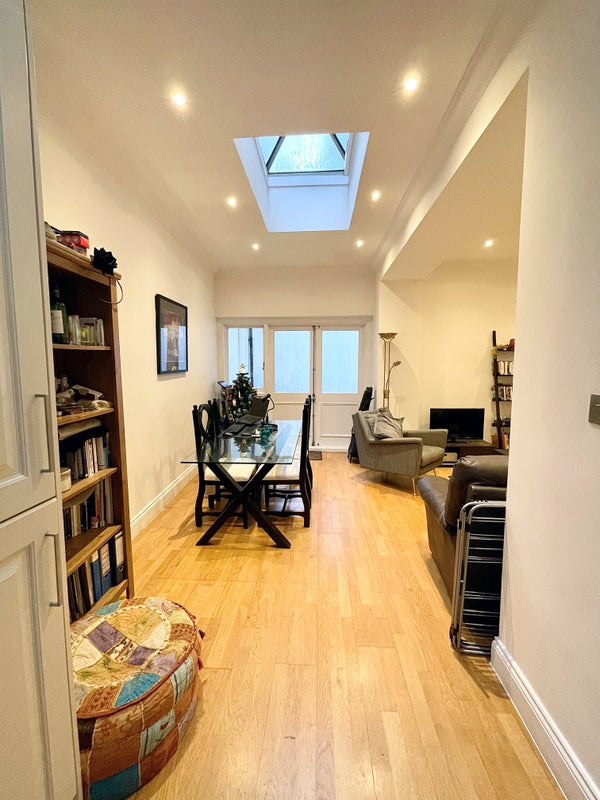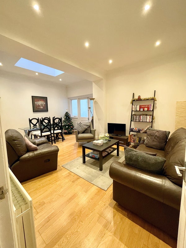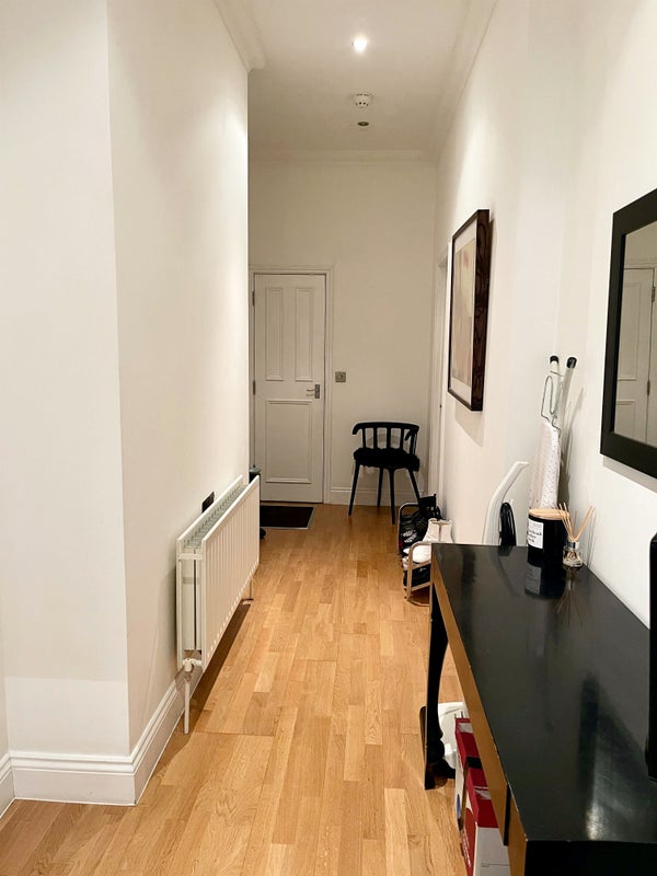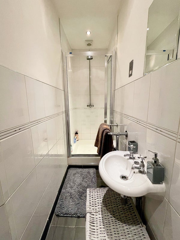 The room itself is situated in a large, open-plan ground floor flat, set across one floor. The flat features an open plan living room, dinning room and kitchen area, with large windows looking out onto the south facing garden patio, providing great natural lighting. There is also another bathroom with a bath and further shower and hallway with additional storage (coat hooks and shoe racks) and a mirror.