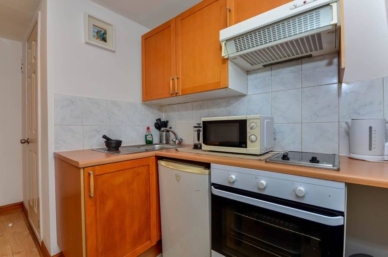 Kitchen features: Oven, Cooker, Fridge/Freezer, Microwave, Kettle, Fitted units, pots, plates, cups, glasses, cutlery