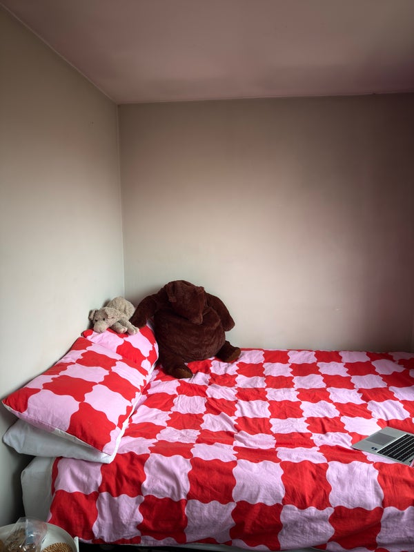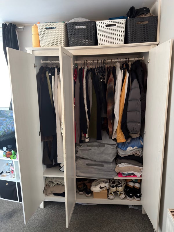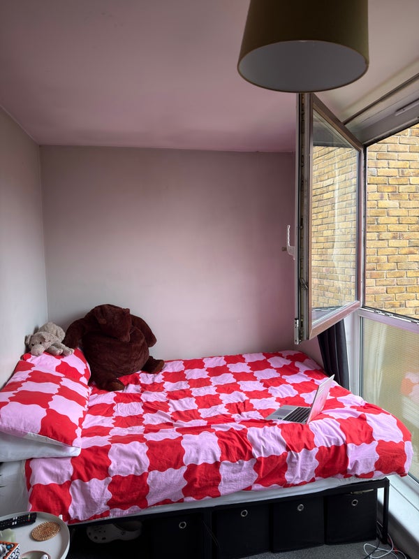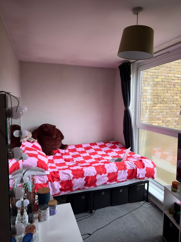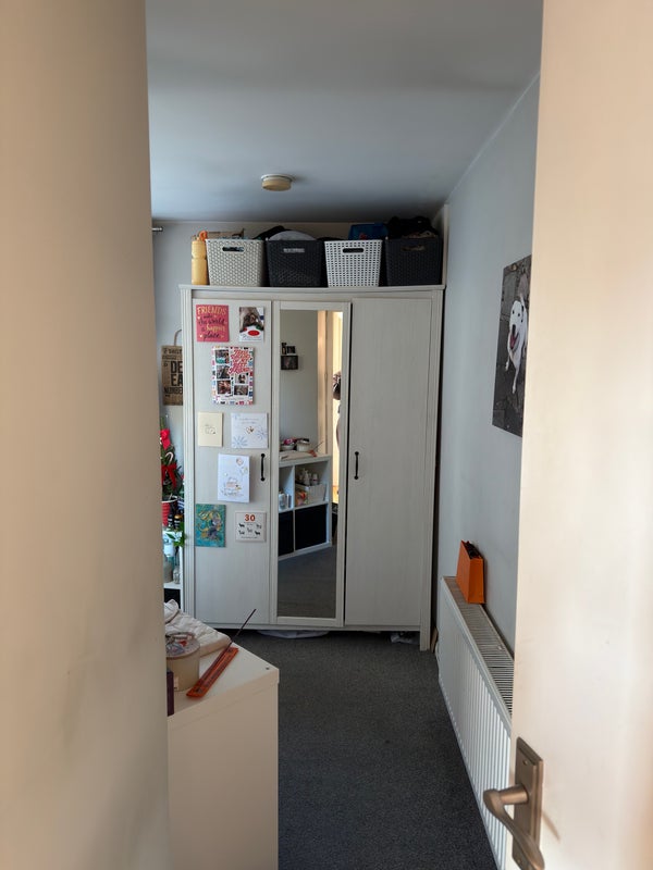 🛏️ Bedroom comes with double bed, large 3 door wardrobe, and a side table. - Room also fits; a desk, a storage unit, TV (which is on another storage unit). Amazing windows which open all the way up & let in loads of light.