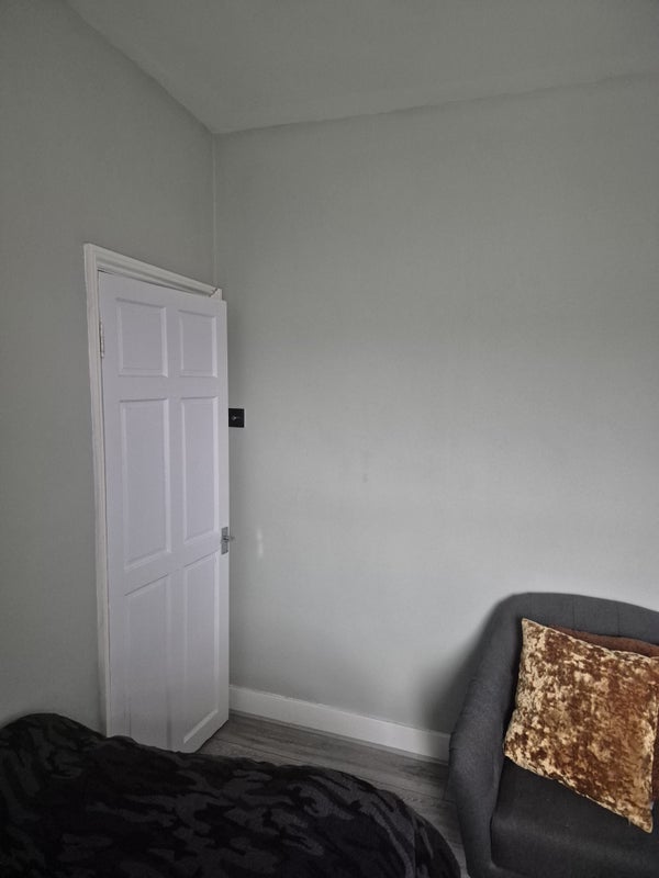A nice sized room is available from March. The room is furnished with built in shelves and a built in wardrobe for storage and a desk and chair.