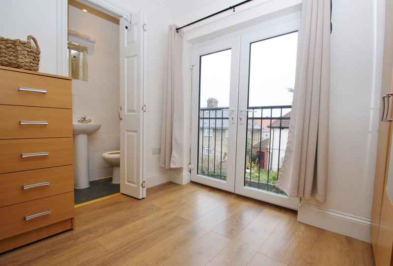 The room benefits from excellent natural light with balcony-style doors, creating an open and airy feel, along with a private ensuite bathroom (shower, WC, sink) for comfort and privacy.