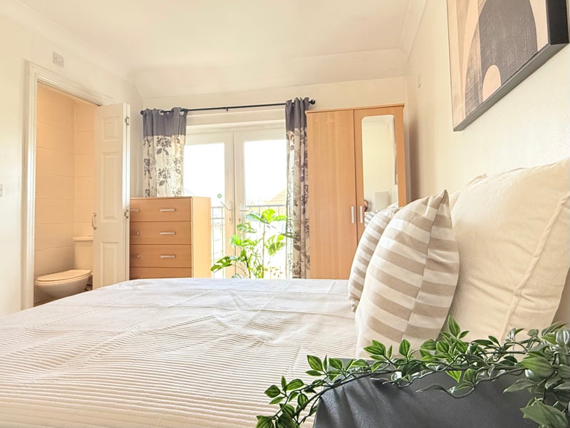 The room benefits from excellent natural light with balcony-style doors, creating an open and airy feel, along with a private ensuite bathroom (shower, WC, sink) for comfort and privacy.