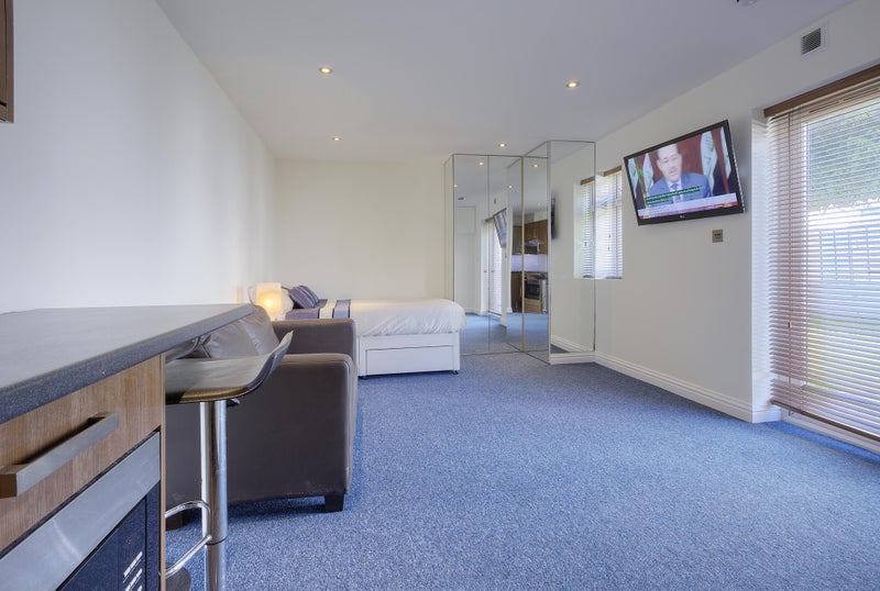 Suitable for singles and couples, the studio is high-spec and equipped with your own bathroom and kitchen. It is spacious, has a TV, and a large bathroom with a walk-in shower.