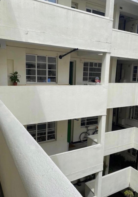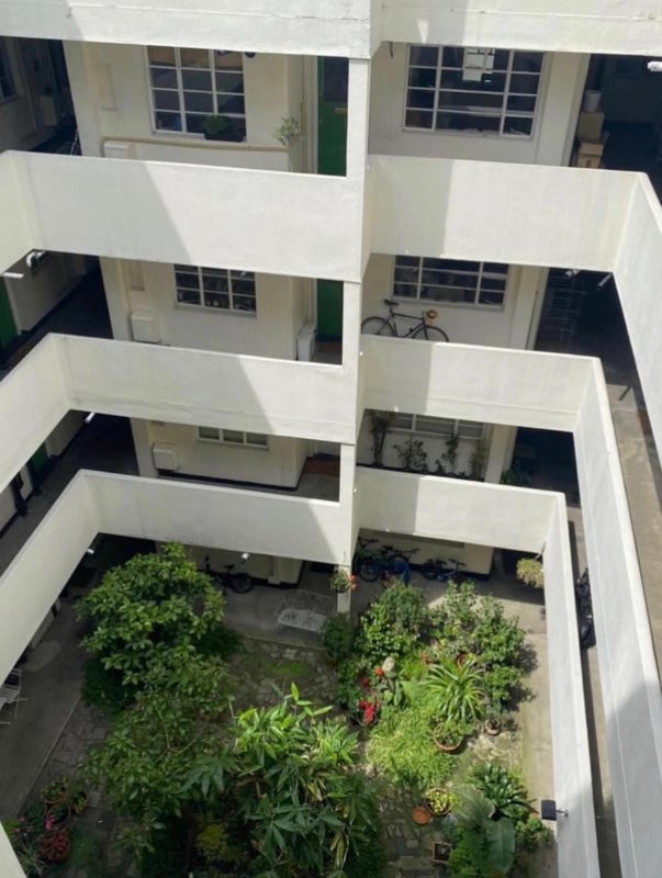 The building is late art deco with interior courtyard and balcony.