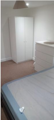 Room is fully furnished with double bed, wardrobe, chest of drawers.