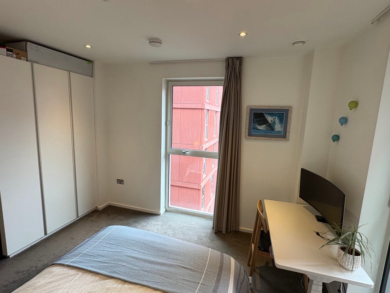 One furnished double, bright bedroom with two large windows (bedroom 2 on the floor plan) is available. The room is spacious and includes a large, built-in three door wardrobe, a large chest of drawers and two bedside tables. There is ample storage space under the Ottoman bed. It looks out onto a green, quiet and residential courtyard.