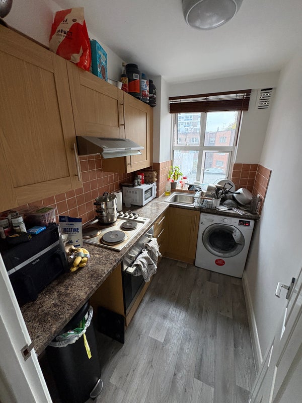 The room is large, bright, and easy to make your own. There’s plenty of space for a double bed, wardrobe or clothes rack, and still lots of room to move around. The two bedrooms are on opposite sides of the flat, so you’ll have great privacy. We share a comfortable living room and kitchen, and the flat includes a washer and dryer.