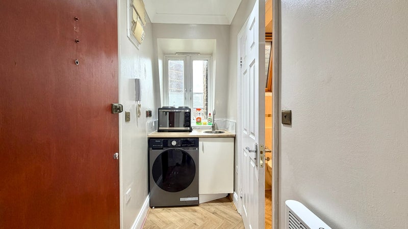 Offering 183 sq. ft. of modern living space, the property benefits from large windows that fill the room with natural light. The studio features a practical kitchenette, washer/dryer, and a private en-suite bathroom, making it ideal for convenient city living.