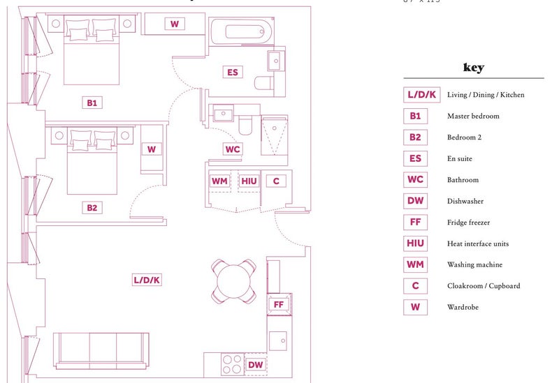 As per the floor plan, this is a 2 bedroom, 2 bathroom property, and it further boast a large kitchen, dining and living room - all in open plan.