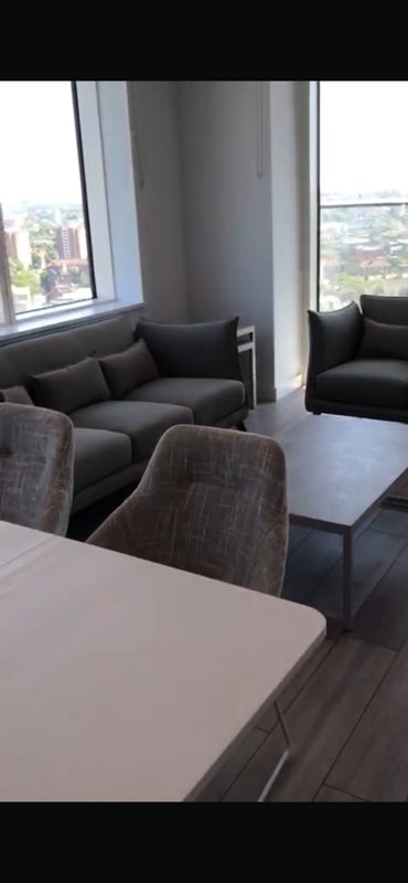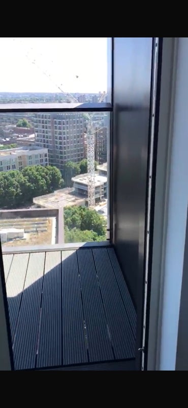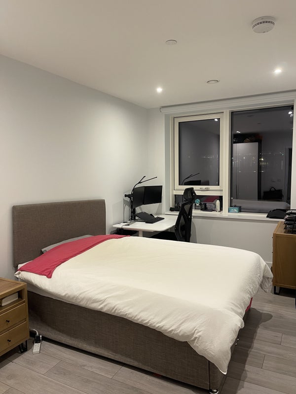 Double room with private bathroom in a modern flat on the 18th floor, with balcony. Building includes 24/7 concierge, gym, private garden, and resident lounges.