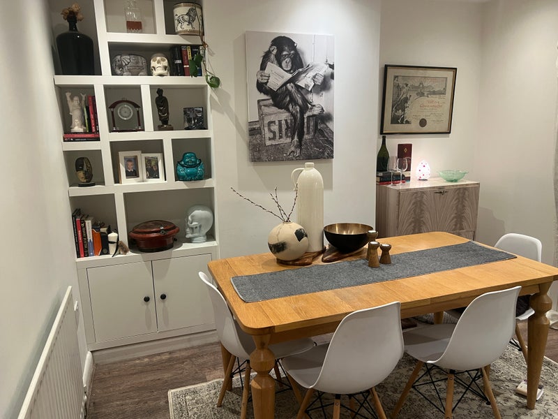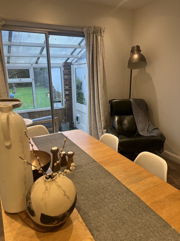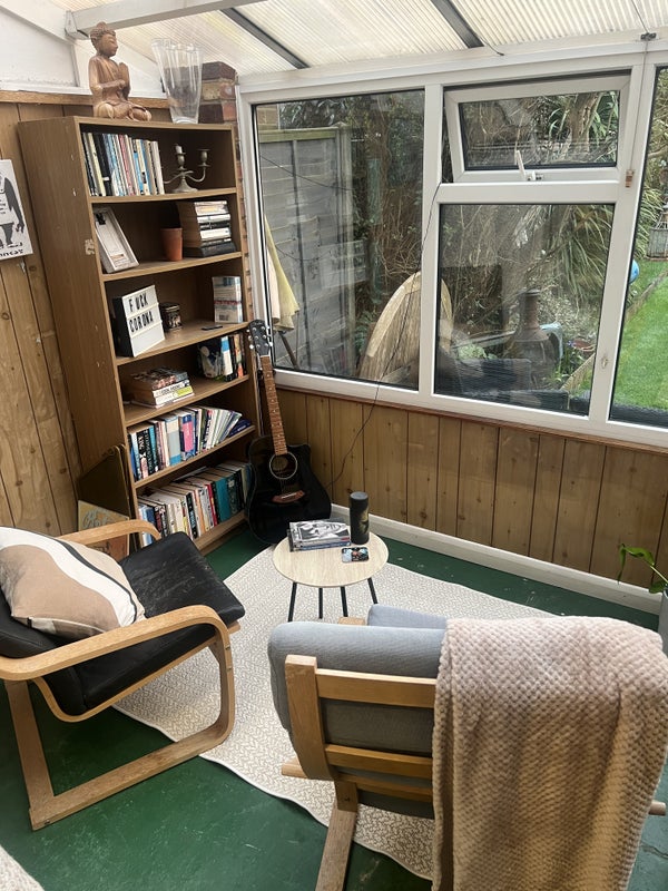 Hello! So I have a room in my house, 2 mins to station (Falconwood zone 4- 20 mins to London Bridge, 30 to Charing x, Victoria, Waterloo). Loads of space. Garden. Big living room, dining room, kitchen, conservatory. Storage space. Furnished. Really comfortable double bed, storage, desk in room - also a study room in the house, and studio outside.
