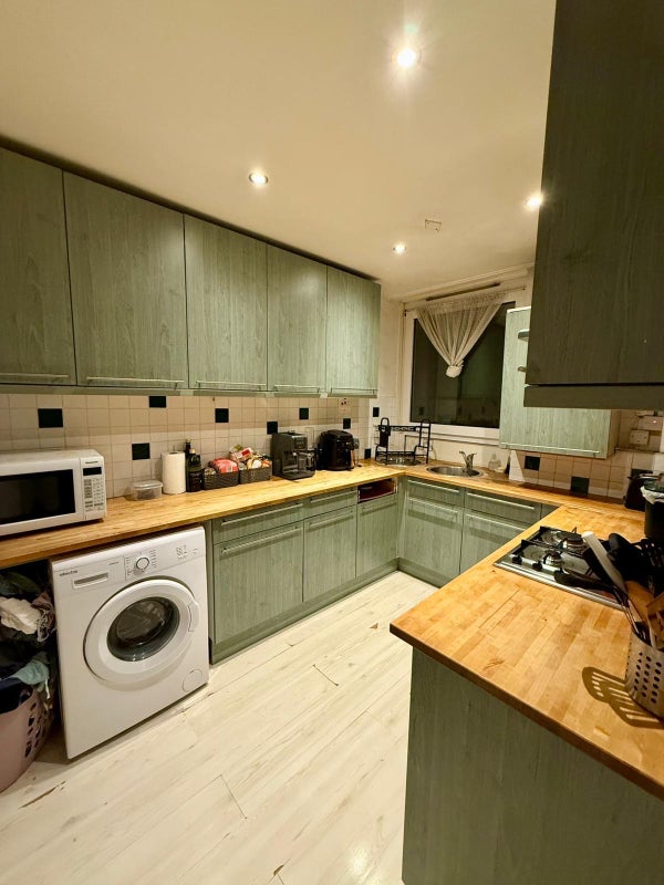 We have a very nice sized kitchen, living room, bath/bathroom separate from the toilet, over 2 floors (all rooms are upstairs and it’s the top floor flat).