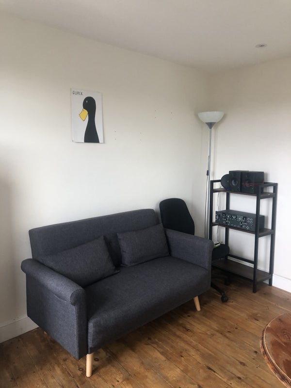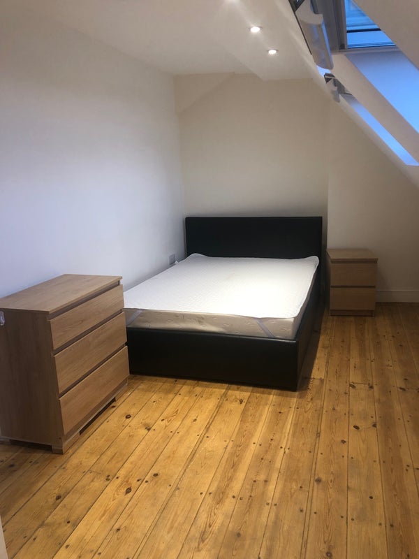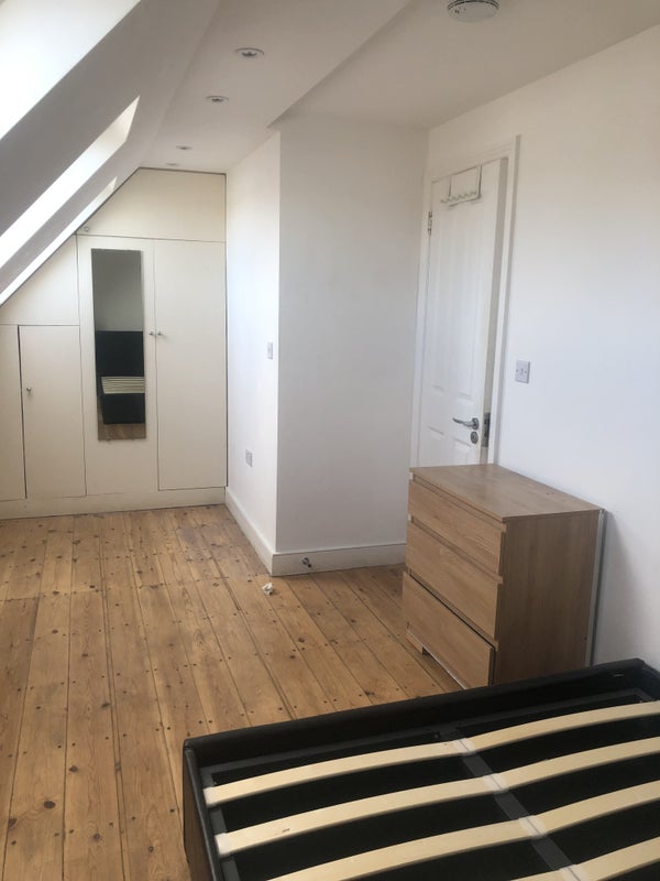 2 rooms in a self-contained loft space (large double loft bedroom with an adjacent living room) in a large house with a big garden/patio/shed and driveway, plus free street parking.