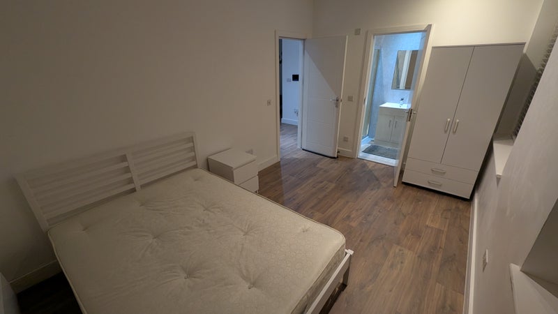 The ensuite bathroom offers plenty of space and comfort. The room is furnished and there is an open-plan living area shared with the kitchen adjacent to it.