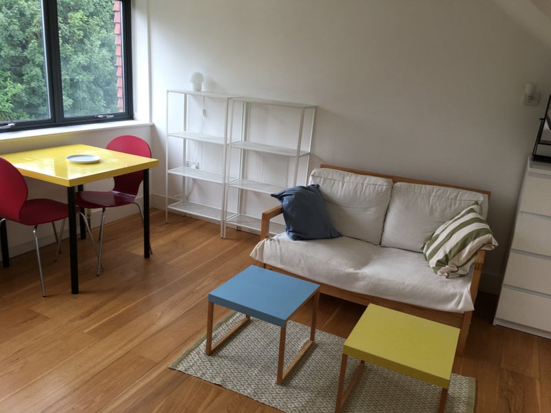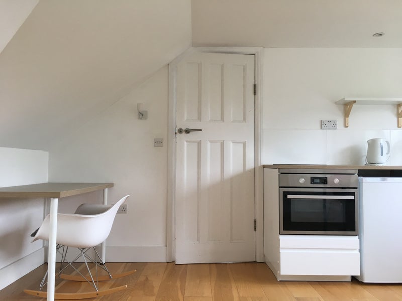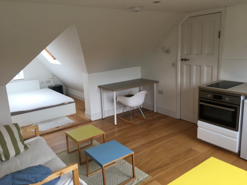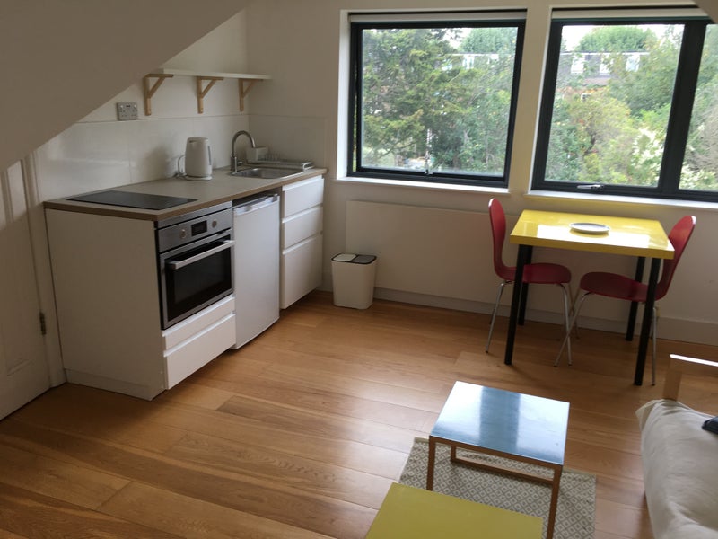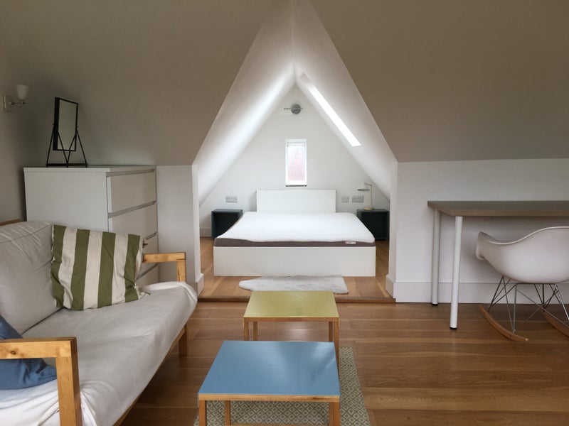 Self contained loft bedsit with en-suite bathroom in Finchley Central, three minutes walk from the underground station with direct Northern line access to the city or the West End. The room overlooks the garden with a pleasant canopy of trees and also has a roof light and small window overlooking the street. Its kitchenette has a proper oven, which doubles as a combi-microwave, a fridge, a two ring hob and a sink. The space also has a small walk-in wardrobe with storage space.