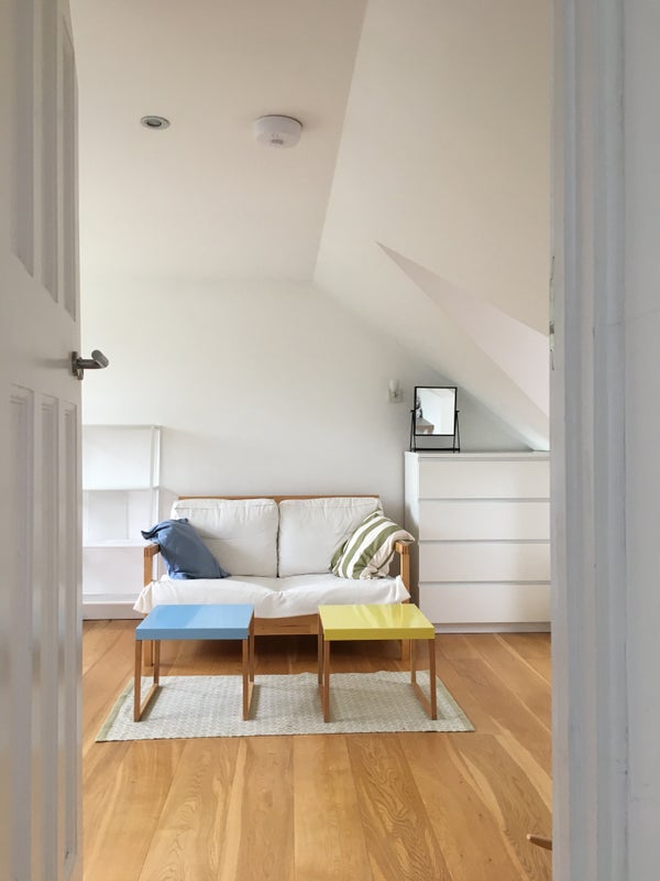 The room is at the top of a quiet family house, but it is acoustically isolated from the ceiling below, so the space feels private.