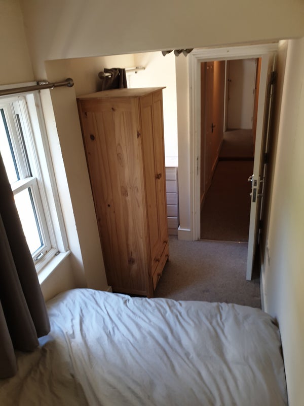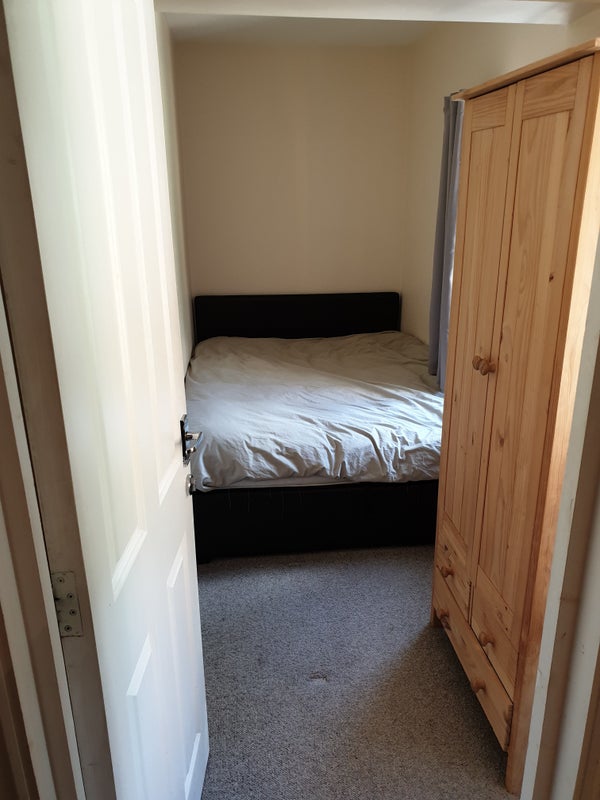 Small Double bedroom (1.5m x 4.2m): £800pcm. Double bed, wardrobe and drawers. Additional hallway cupboard storage. Single occupancy only. Available 22 Feb.