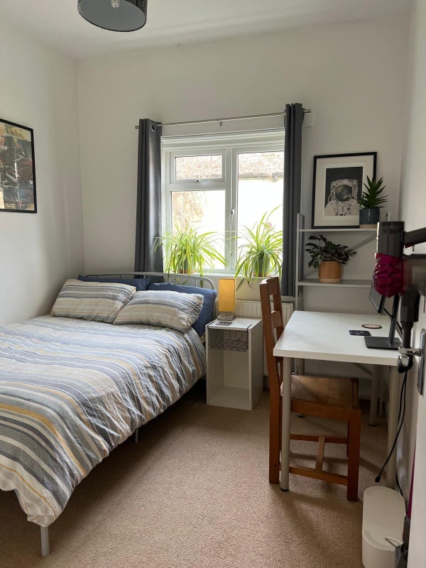 The room is a furnished double room including a double bed, built-in double wardrobe, shelving unit, bedside table and optional desk/computer table and chair. The bed can be positioned in two different arrangements (see photos). The room is quiet and private with a view into our rear garden.