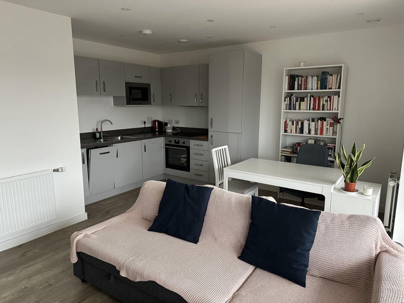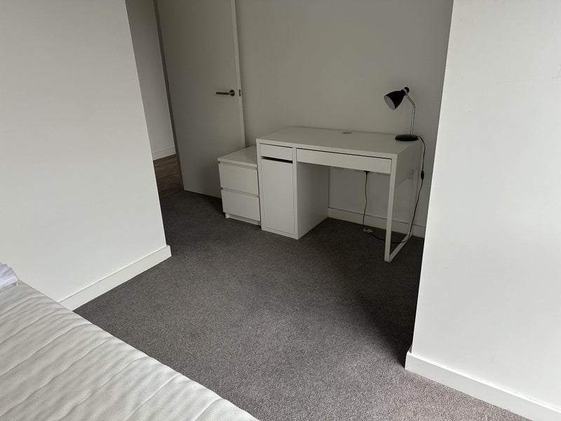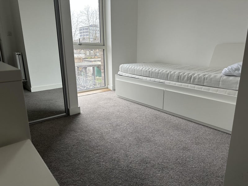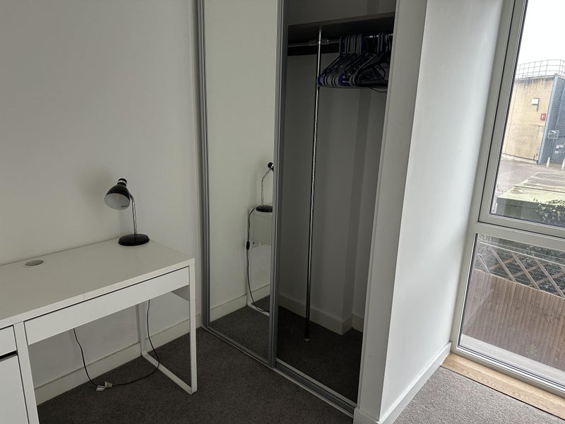 Bright and beautiful single room, fully furnished with a fitted wardrobe and desk. It is located in a two-bedroom flat with two bathrooms and an open-plan kitchen and living room. The flat is very spacious and comfortable with a large balcony, situated in a newly built development that is very quiet and sunny throughout the day. It is within a private gated community protected by security.