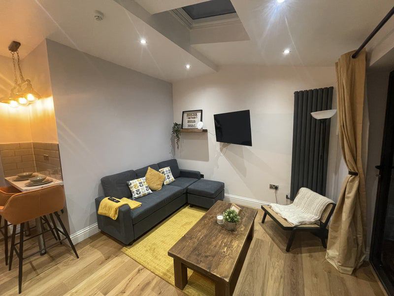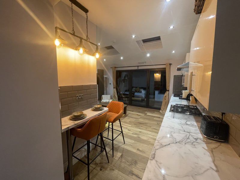 State of the art modern design living area with L shaped sofa and 43’ television. On looking huge garden and patio area ideal for summer relaxation.