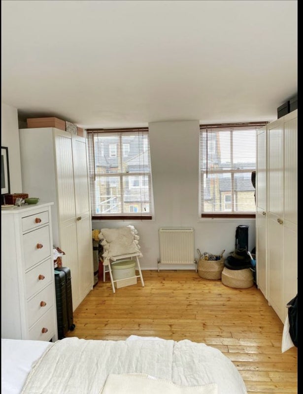 Bedroom 1 and en-suite bathroom take up entire top floor of the flat and is fully furnished. With 3 x skylight windows to the front and 2 x sash windows to the back, it's bright and airy, with plenty of storage space.