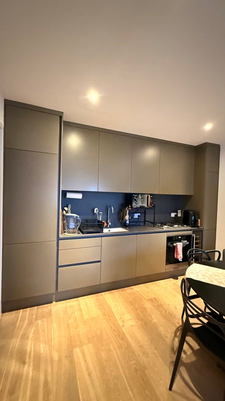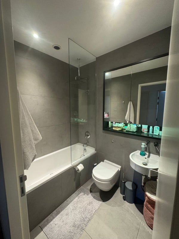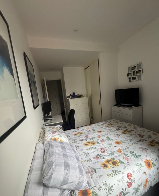 The bedroom includes a built-in spacious wardrobe and a double bed. The current flatmate has added two chests of drawers and a small desk (these will be taken with her), but there is ample space should you wish to bring or add your own furniture.