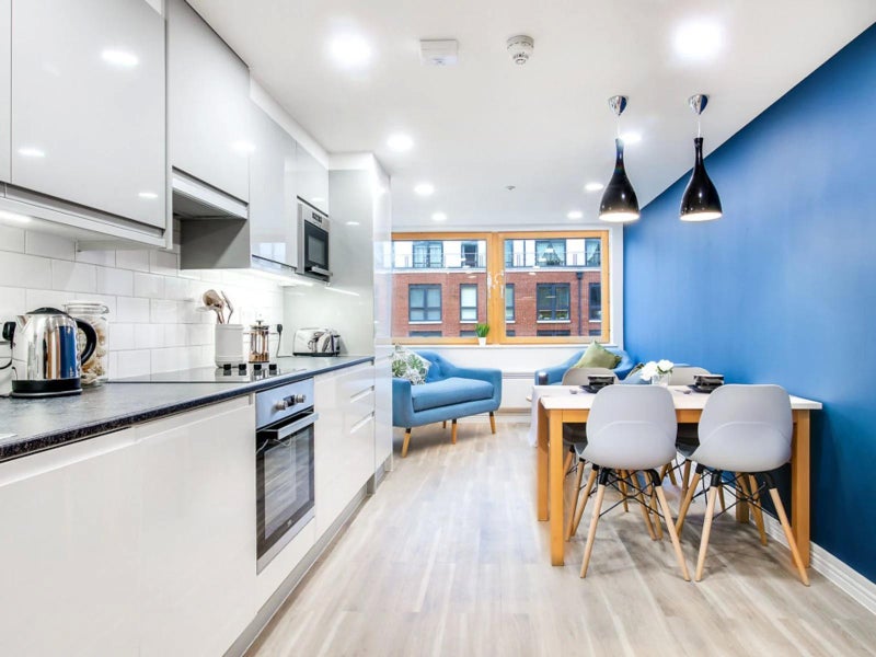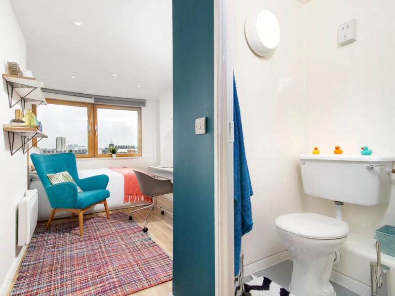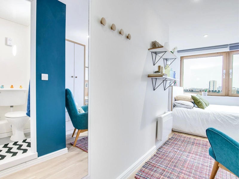 The room is en-suite, with a double bed and a modern furniture. There is a shared kitchen with 4 more people. Also the student accomodation have washing and drying machines and a social space.