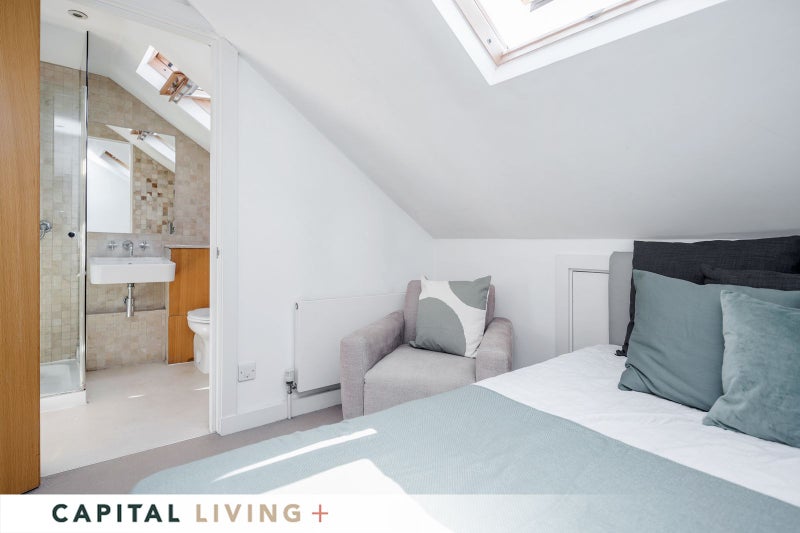 💚 Room 1: A bright and spacious top floor en-suite double bedroom in our lovely professional house share. Fully furnished.