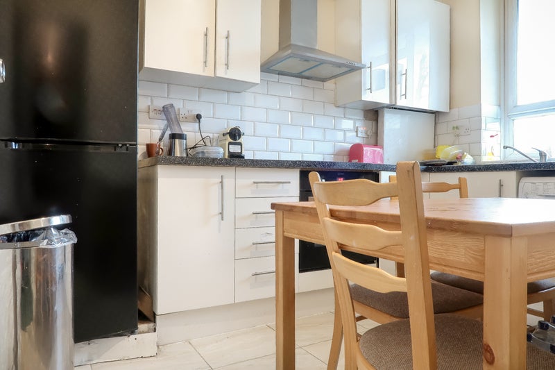 The flat includes a large kitchen with a dining table, two large fridges, 2 bathrooms, and a separate WC.