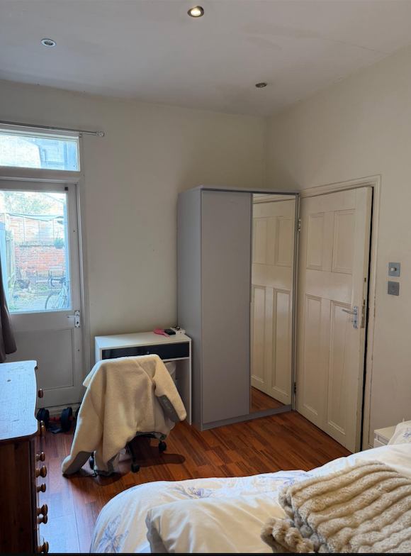 It's a double bedroom with a door that leads out to the yard. The mattress is also less than 2 months old. It's the only bedroom that is downstairs. The other bedrooms are upstairs along with the bathrooms. Everything in the photos is staying so it's a fully furnished house/room.