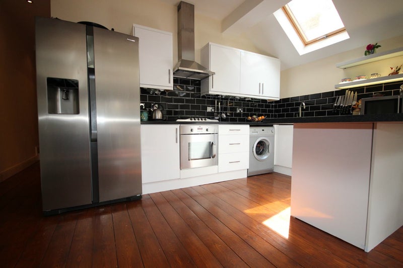 The modern kitchen is well equipped with a large American fridge freezer, washing machine, dishwasher, 5 burner hob and lots of storage space.
