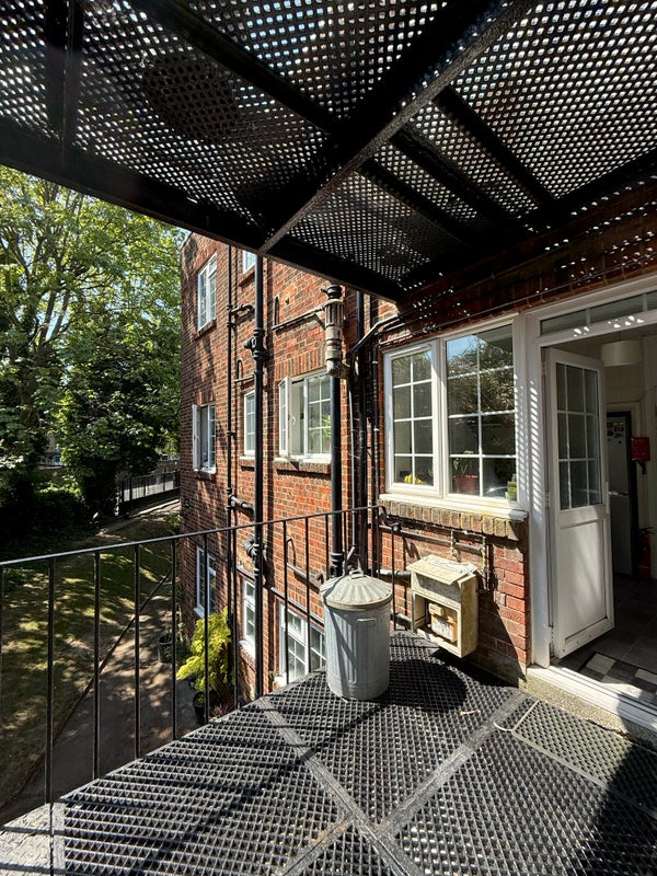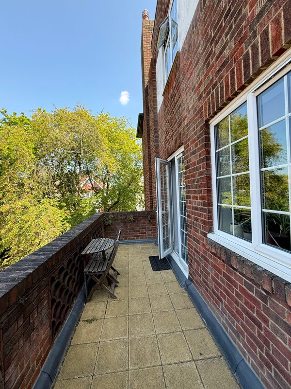The flat is on the second floor and includes a shared kitchen, bathroom, separate toilet, and living room with a balcony overlooking a quiet, flower-filled courtyard. All bedrooms have their own locks and keys. The building is secure with electric gates.