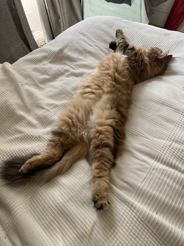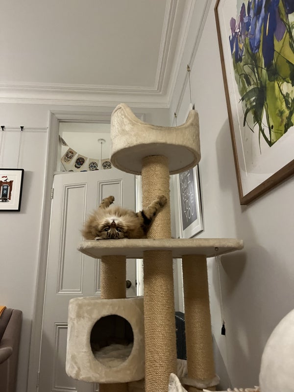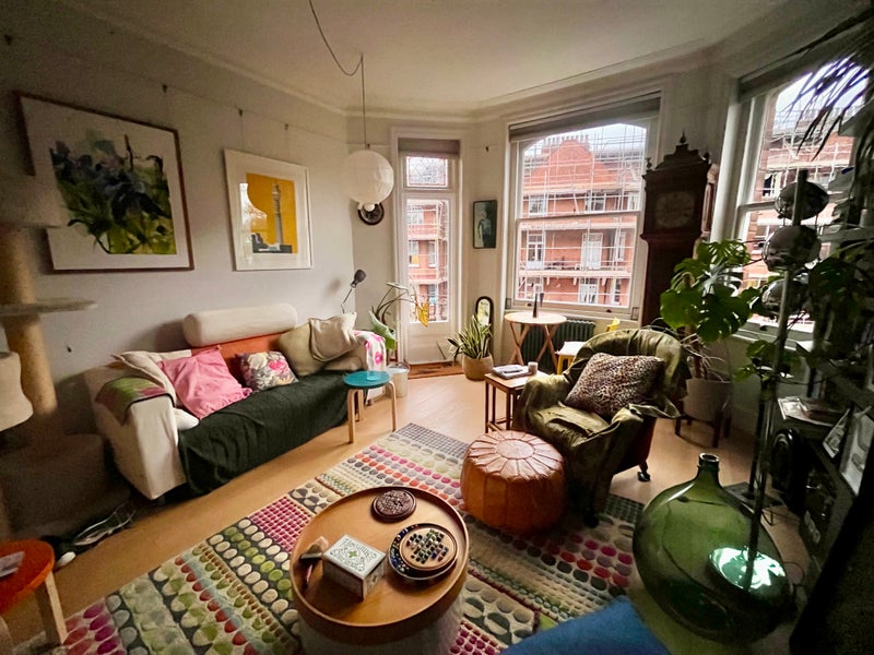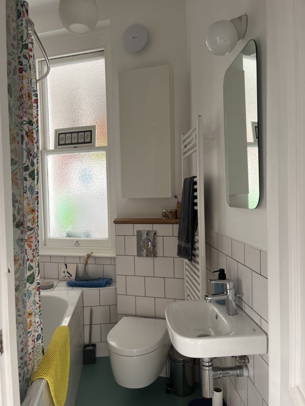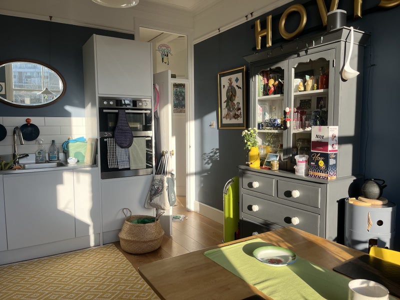 The flat has a large kitchen diner, large living room, two narrow balconies, two bathrooms and one very fluffy cat. My partner lives with me at weekends.