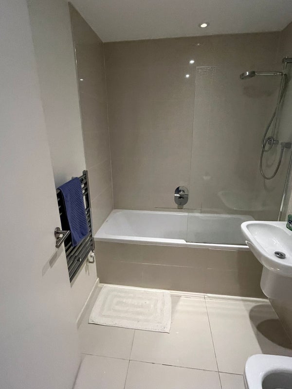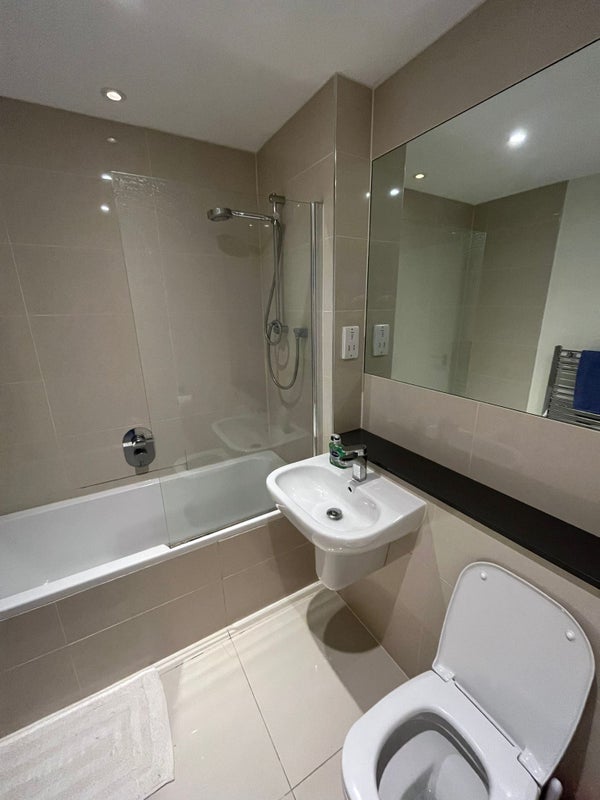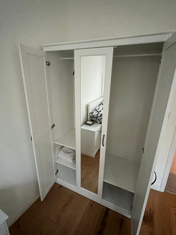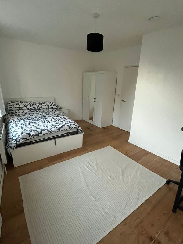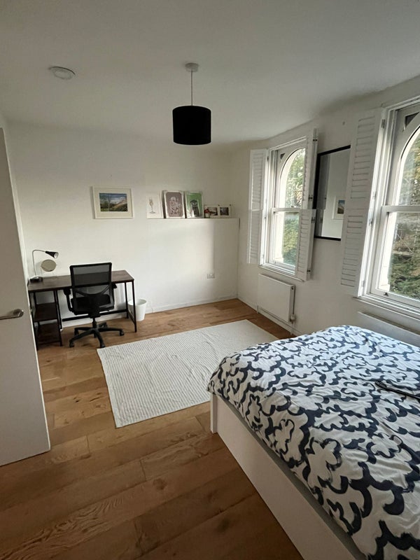 Large, bright, furnished double room with plenty of storage space and en-suite bathroom. Situated in a quiet, secure 3 bed apartment, with high ceilings and wooden floors and access to a fully equipped kitchen.