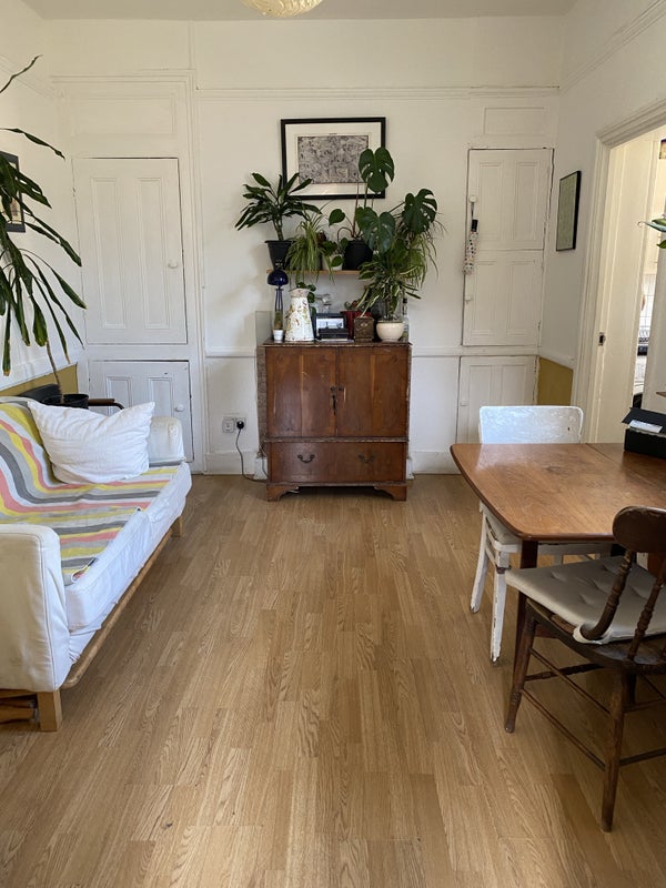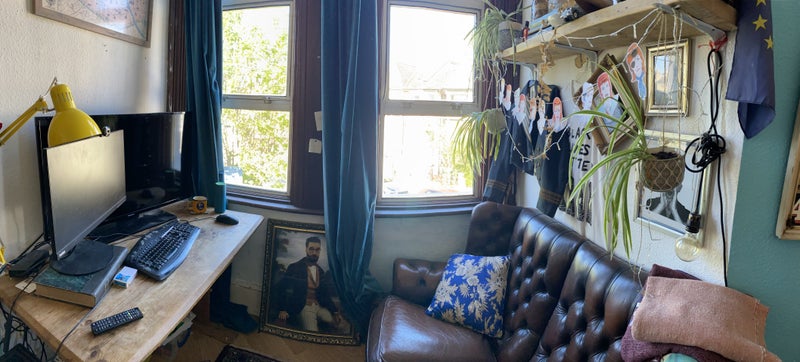 Double bed, large desk, ability to setup a home office next to bay window in well lit West facing 1st floor double room. Plenty of books to read on the sofa with lots of natural light coming through the bay windows. Large TV also has a GoogleChrome cast and cabling to be used as a larger monitor.