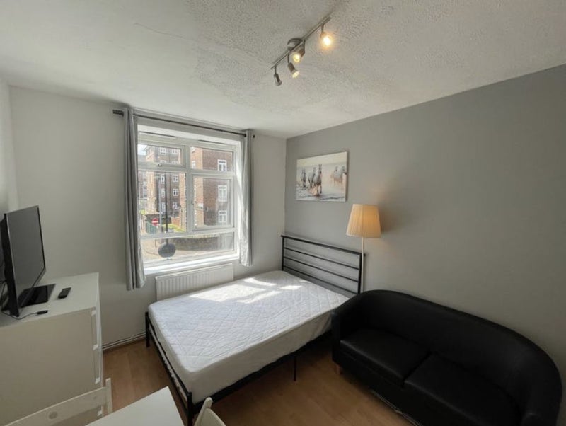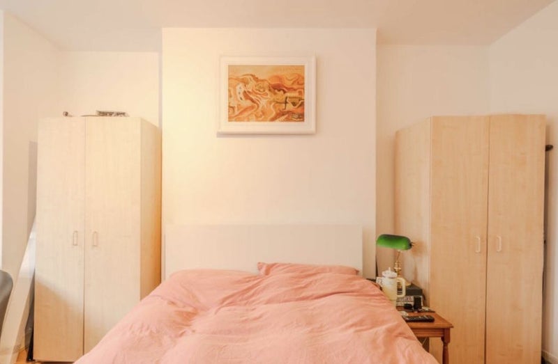 Fully furnished with a double bed, wardrobe, drawers, bookcase, mirror, sofa, dining set, blackout curtains & a large Smart TV. Your own room key + designated space in the bathroom, kitchen & fridge. 🔑