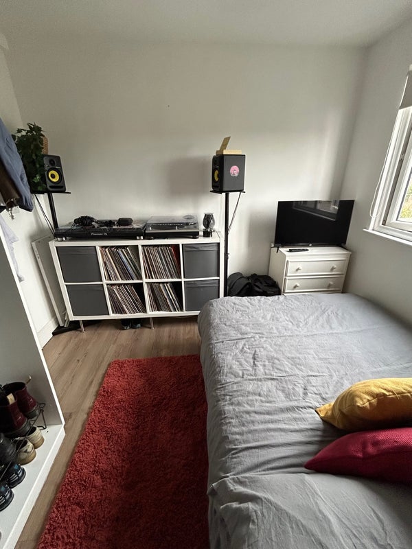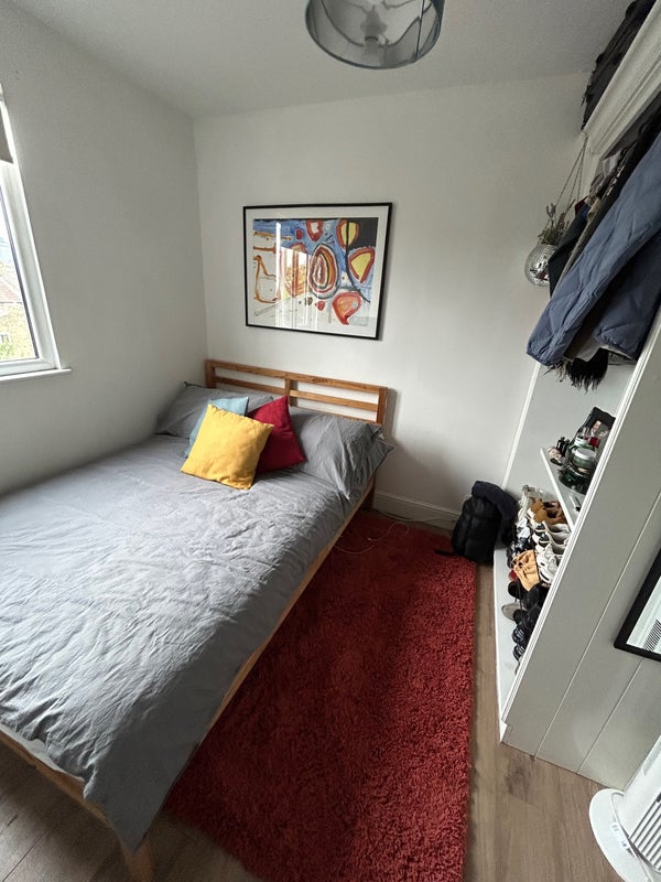 Located on the top floor, the room shares a bathroom with just one other housemate. It comes furnished with a bed and chest of drawers, with storage under the bed and above the wardrobe. (The shelving unit pictured will be coming with me, giving you more space.)