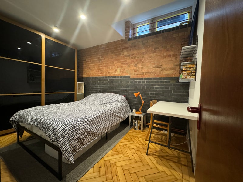 The bedroom is a double, with exposed brickwork, and modern decor, as well as a desk area and double wardrobes with drawers for ample storage and those who have a lot of “stuff”