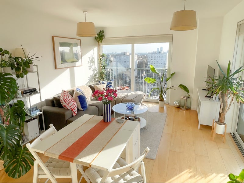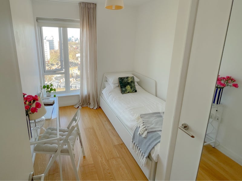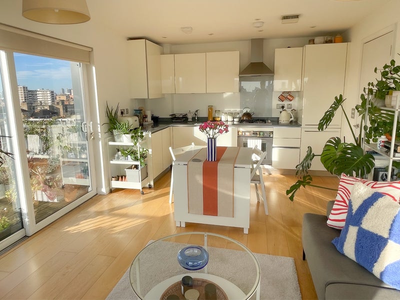 The flat is on the top (9th) floor of a modern apartment block in the heart of Hackney. It's modern and clean with a double aspect living room/kitchen with amazing views over London and a large south facing balcony with an outdoor sofa.