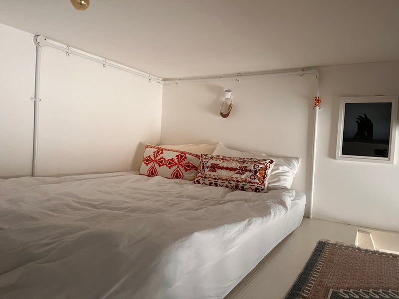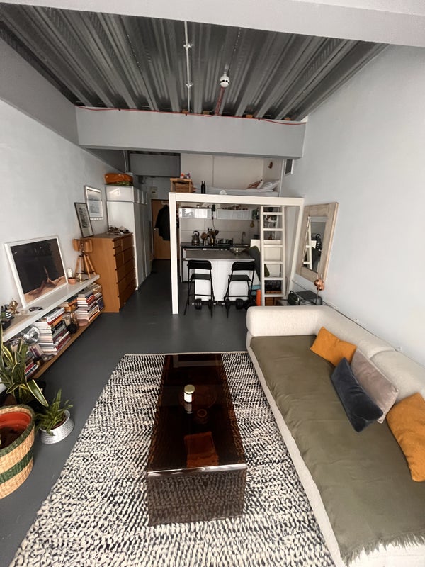 This is a warehouse-style studio with high ceilings, a mezzanine, a Juliet balcony, and a generous open living space. It is fully furnished and has everything you need to feel at home.