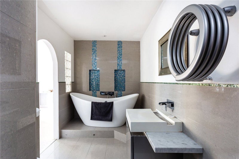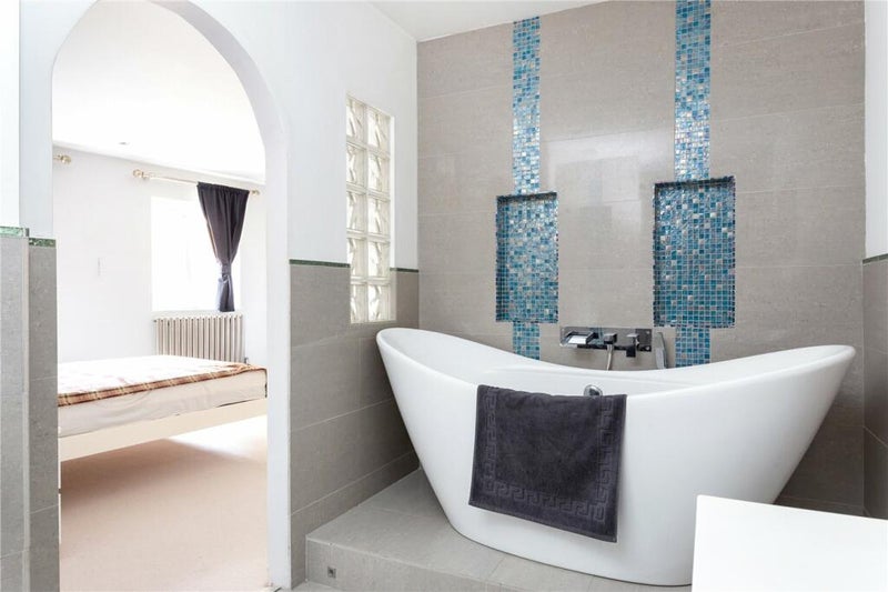 The ensuite has a freestanding bathtub and shower, modern finishes and underfloor heating (included in the rent).