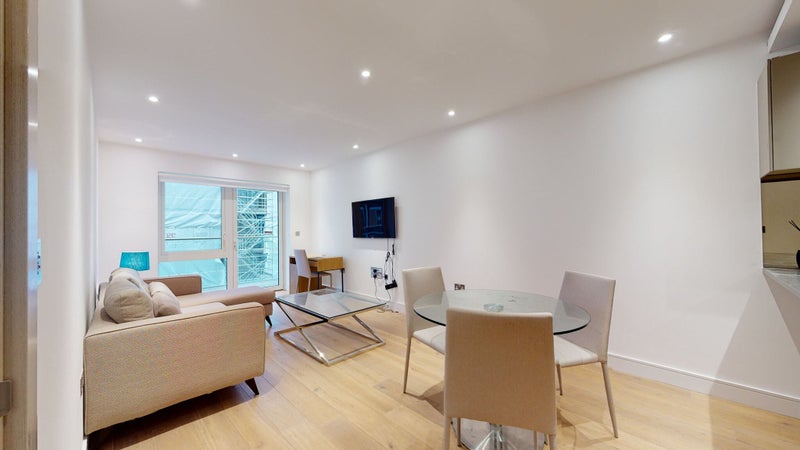 With plenty of light, this 702 square foot spacious apartment has floor to ceiling windows in every room, a large private balcony and a landscaped gardens. Apartment further comprises a double bedroom, large bathroom, built in wardrobes, and a big reception area with a contemporary open plan kitchen with integrated appliances.