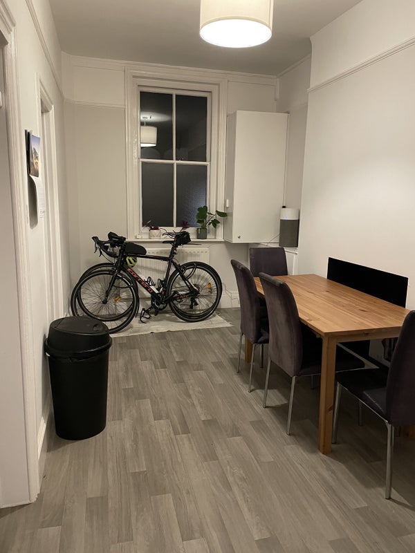 The flat is big with high ceilings and original fireplaces, we are very lucky to have a dining room, living room, 2 bathrooms and a shower/bath. There's lots of storage, 2 large communal cupboards. There is also bike storage.